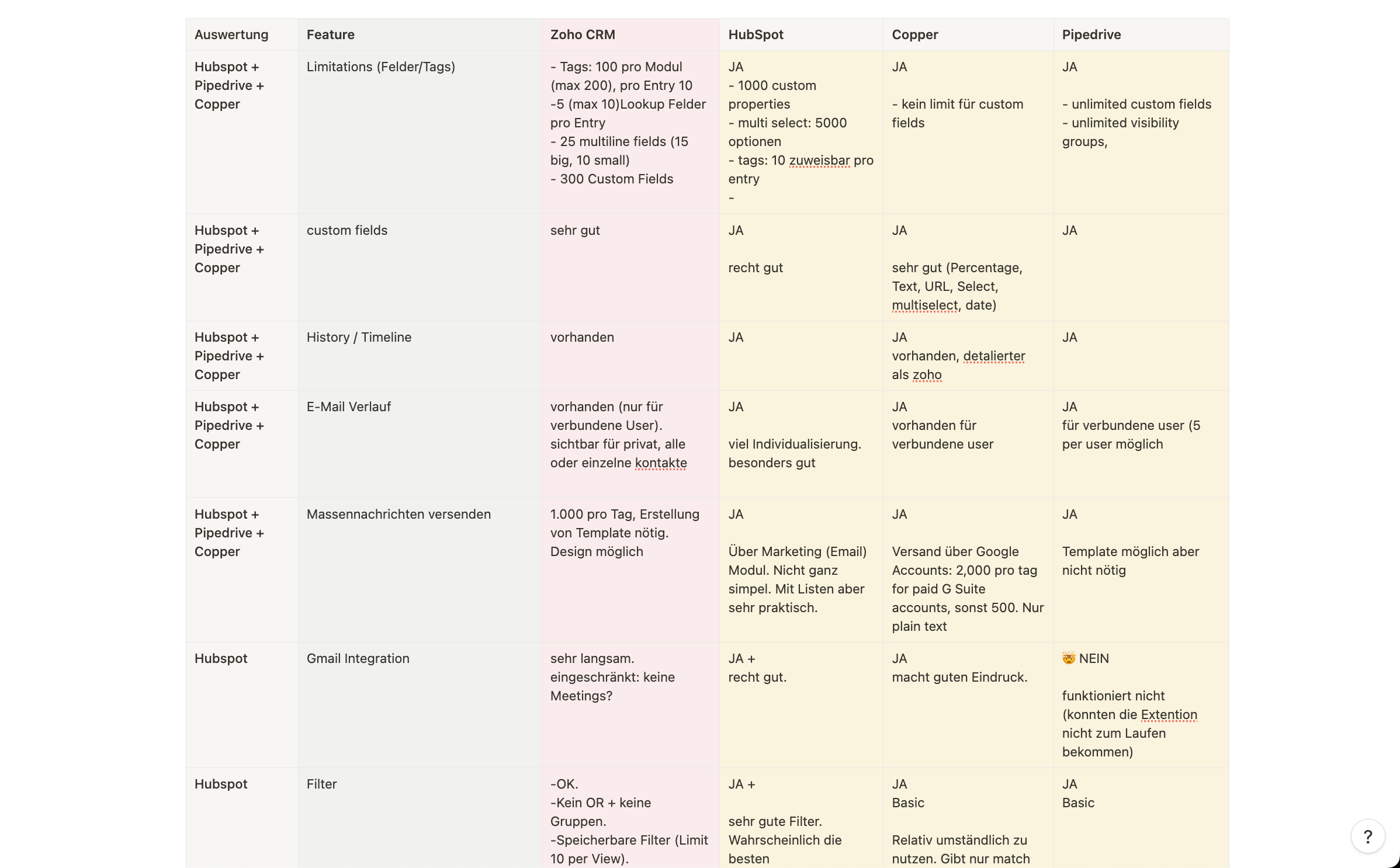 After a research phase we selected a few candidates and rated Zoho CRM, HubSpot, Pipedrive, Copper, CiviCRM and Folk on the defined criteria.